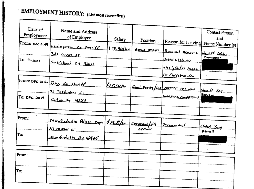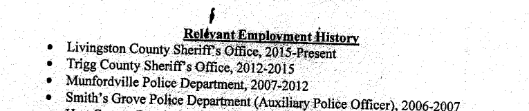 On August 10, 2020, we learned that, at Deputy David Kings current employer (C.C.S.O.), David admitted to being fired from Munsford P.D. and omitted that he was fired from Smiths Grove P.D. for making other false arrest. Had David been truthful on his application, 50% of his work history would reflect termination due to the type of chaos that David has caused James Samples and James’ children. The false arrest against James brings that percentage to at least 75%.