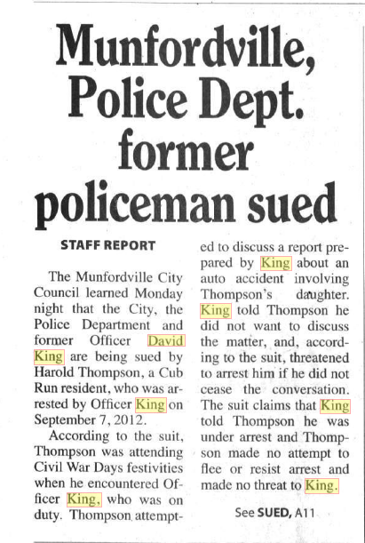 Smiths Grove Police Chief fired David King prior to David finishing the Police Academy for making a false arrest against Rondel Davis Jr. of Bowling Green.