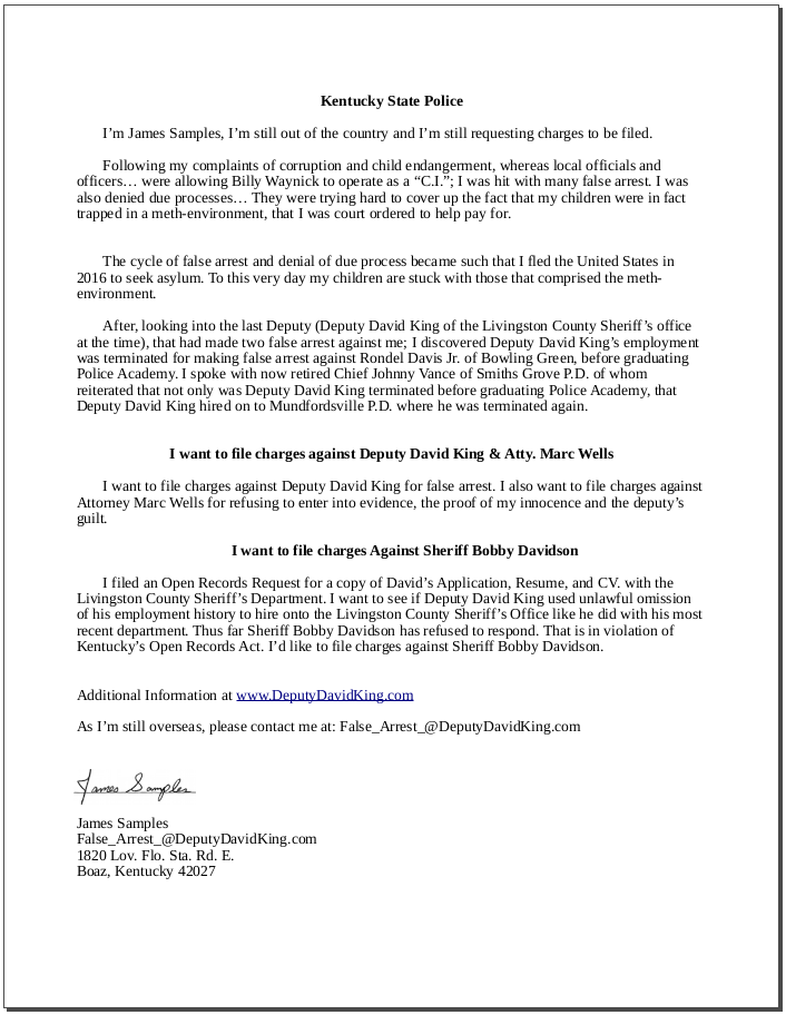 I’m requesting charges to be filed against Deputy David King, Attorney Marc Wells, and Sheriff Bobby Davidson.